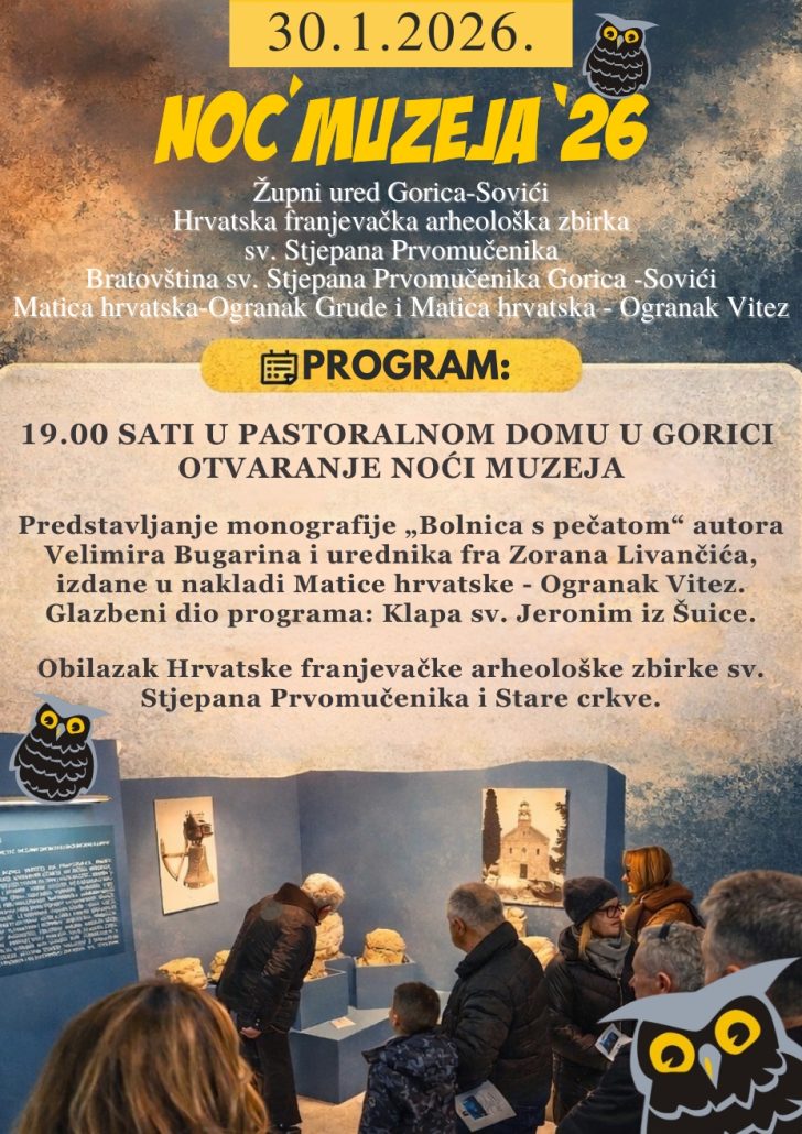 Nakon predstavljanja monografije nema žurbe – iskoristite večer za obilazak Hrvatske franjevačke arheološke zbirke sv. Stjepana kao i Stare crkve sv. Stjepana u Gorici, u posebnom večernjem ugođaju.